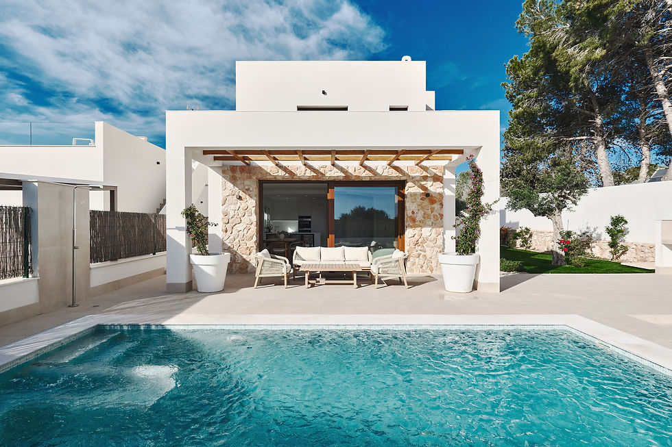 This stunning modern new-build villa sits on a generous 410 m² plot and is designed over two floors, combining sleek contemporary interiors with timeless Mediterranean style.